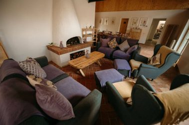 The dining area includes the restaurant, where the designers have chosen to refurbish many elements from the old barn, a covered terrace, and a chimney.